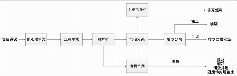工藝流程:采用熱解技術外部加熱形式,將物料加熱至300~500℃,含油污泥中的水、油品等在密閉無氧空間中蒸發析出,經過冷凝系統后使揮發物凝結,在通過油水分離裝置分離出油品,油品經過加工后出售。產出的不凝氣可作為補充燃料使用。